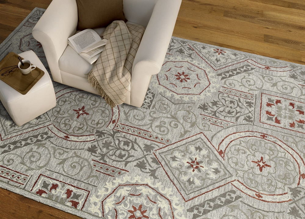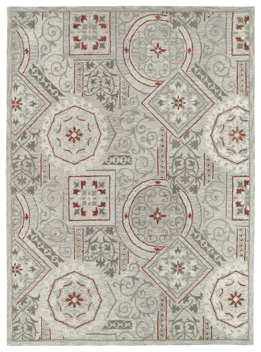 Brooklyn is a collection of unique and independent patterns each conceived to highlight individual choice and preference. The Brooklyn Collection is enthusiastically hand-tufted with pride from Kaleen artisans from only the finest multi-textured 100% Virgin Wool Pile. Made in India. Detailed colors for this rug are Grey, Steel, Dark Ivory, Brick Red, Light Sage Green. This rug is available at our . Please call one of our Rug Specialists at 1-833-428-1199 for additional information (available Monday through Saturday, 10am to 6pm Pacific Time).